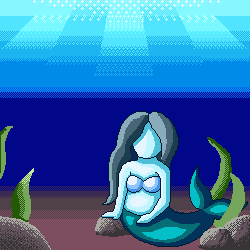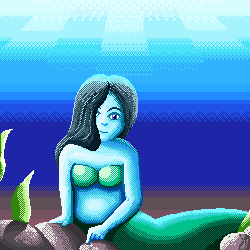 Last time I posted my very first pixel art (though not finished in that order) and today I’m sharing my second! Which started as a simple practice piece to help me do the sky and mountains in Dream Haven, but the blue colors and gradient reminded me of the ocean, and so I added some rocks, and then was like, “hey, a mermaid would look really good there” and things just escalated from there. Anyway, here she is.